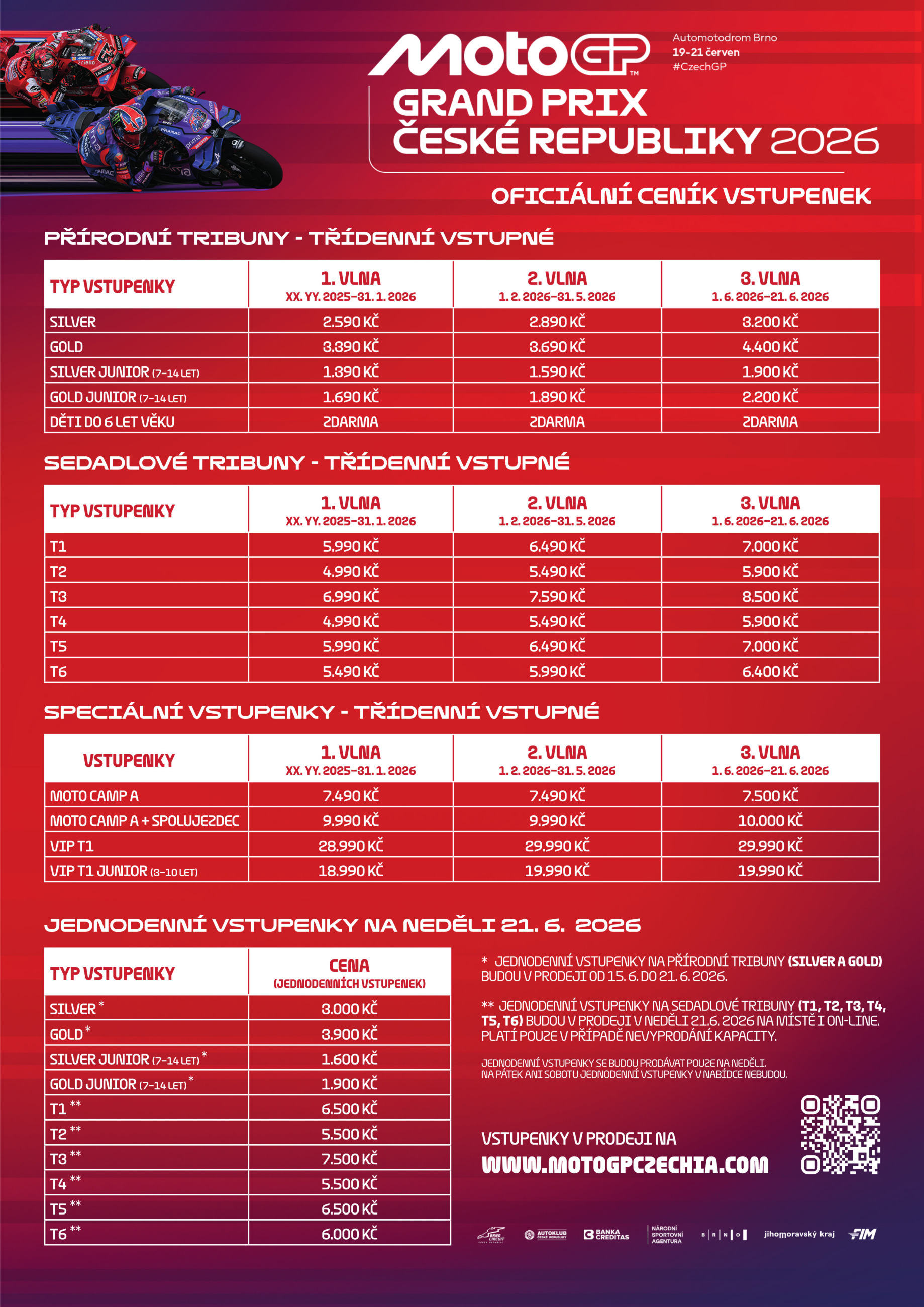 První vlna předprodeje, končící 31. ledna 2026, je cenově nejvýhodnější a vzhledem k omezené kapacitě některých typů vstupenek organizátoři doporučují nákup neodkládat. Stejně jako letos v červenci budou jednodenní vstupenky na neděli v prodeji až těsně před závodním víkendem.
